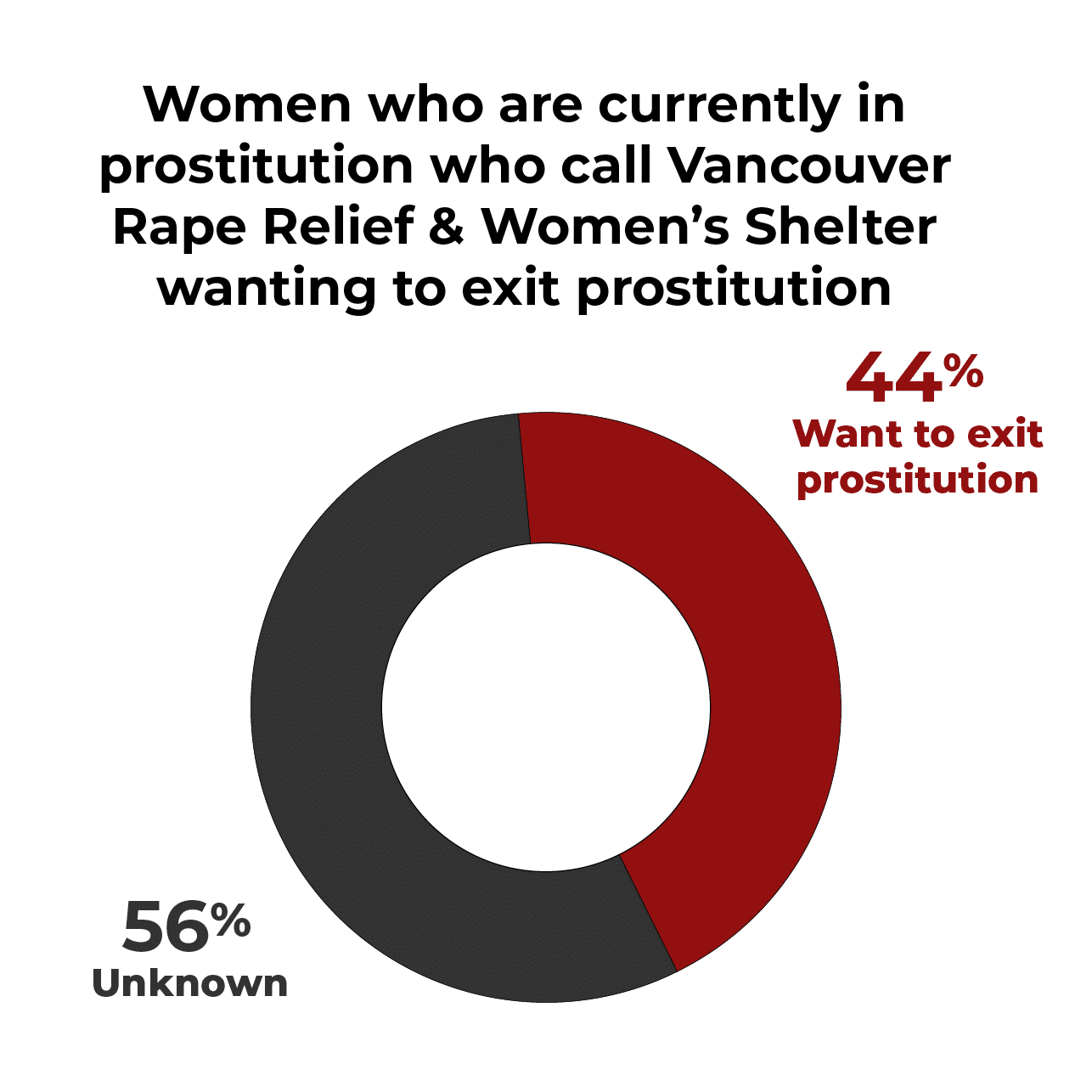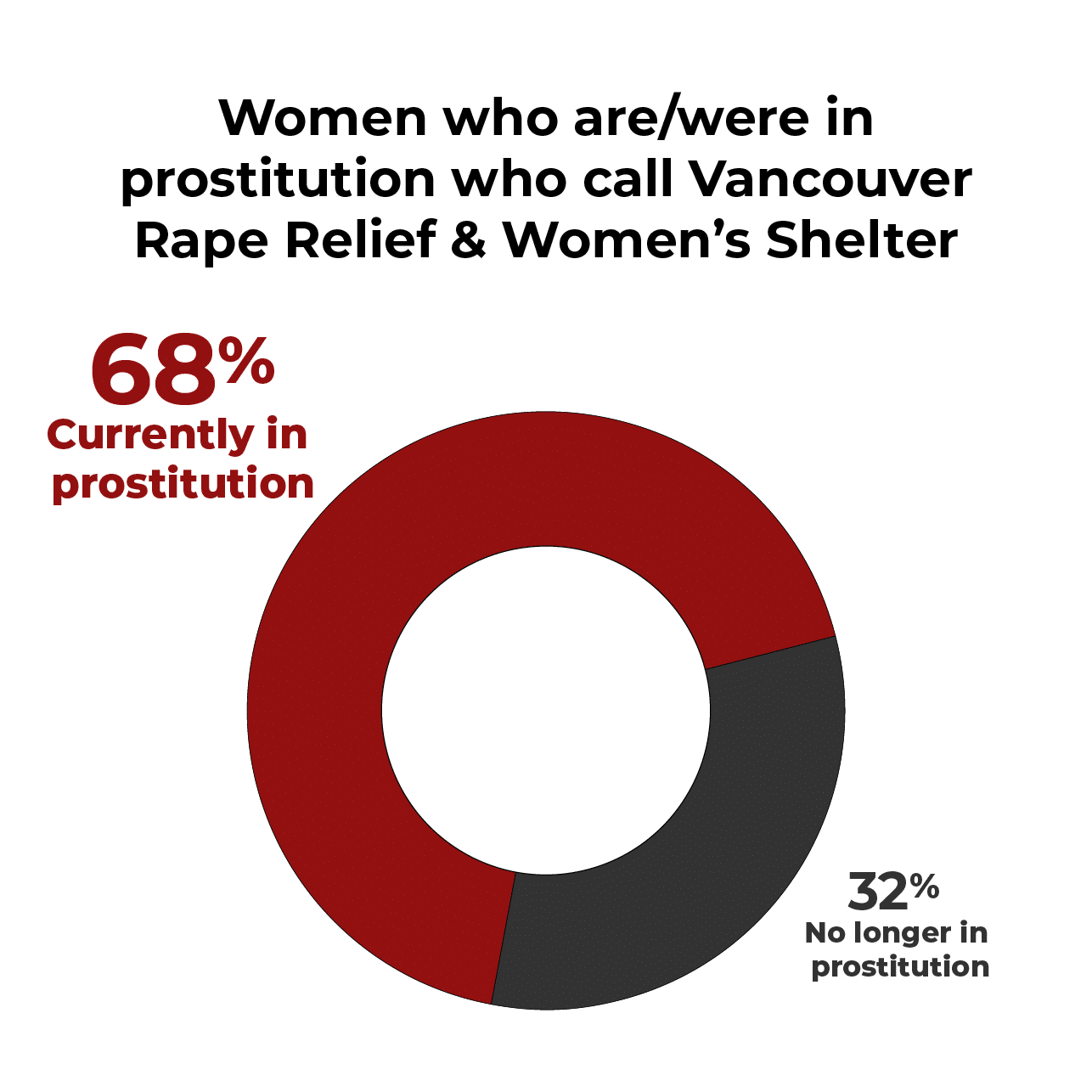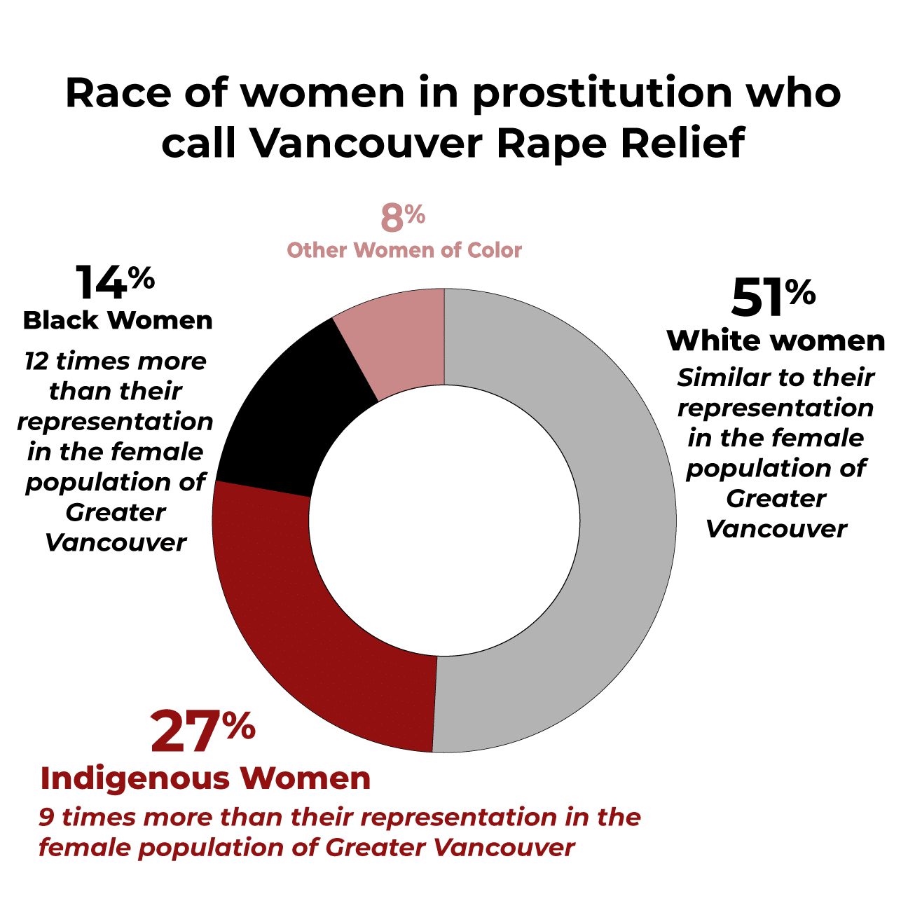 Indigenous women are only 3% of women in Metro Vancouver, yet they make up 27% of the women in prostitution who called Vancouver Rape Relief. Black women are only 1.2% of women in Metro Vancouver, yet they make up 14% of the women in prostitution who called VRR. This data reflects the intersection between racism and sexism in prostitution. While all women are vulnerable to male violence, the rate of victimization for racialized women is even greater. This pattern is also reflected in the data of our work with battered women, as 72% of the women who stay in our transition house are women of colour or Indigenous women.