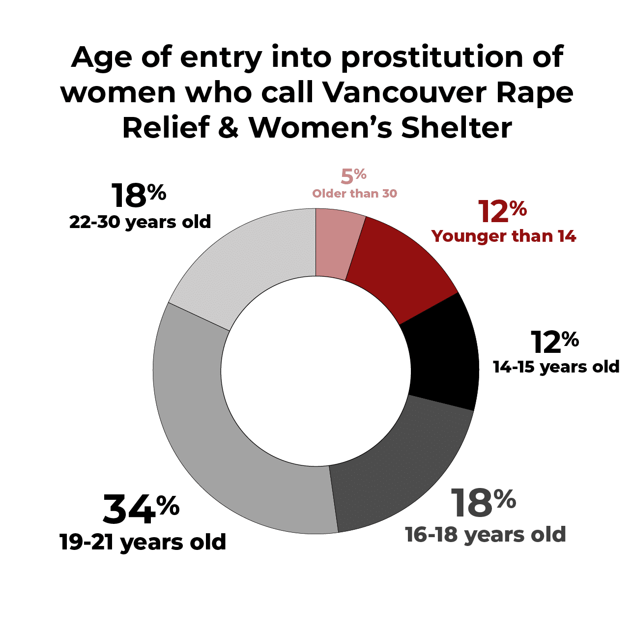 Of the women in prostitution who called Vancouver Rape Relief (VRR) 24% were 15 or younger when they entered prostitution. Furthermore, 43% of the women who called VRR were โunderageโ (younger than 18) when they entered prostitution. Most often, the girls resorted to prostitution because of on-going sexual assault by their father (in some cases the father also pimped the girl) or grooming by an adult โboyfriend,โ who often gave them drugs to make sure they stayed dependent on him. Most girls in these situations were โrunawaysโ from abusive homes and/or raised in foster care.