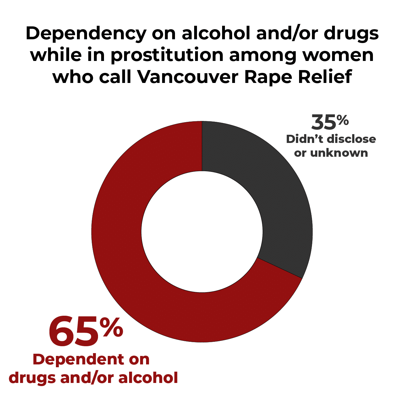 Of the women in prostitution who called Vancouver Rape Relief, 65% disclosed their addiction to alcohol or drugs. Some women told us that they were first dependent on drugs (most often as a coping response to past sexual violence) and turned to prostitution as a means to pay for the drugs. Other women told us that they started using drugs or alcohol frequently as a way to cope with the experience of being in prostitution. Some said that they canโt engage in the act of prostitution without being high.