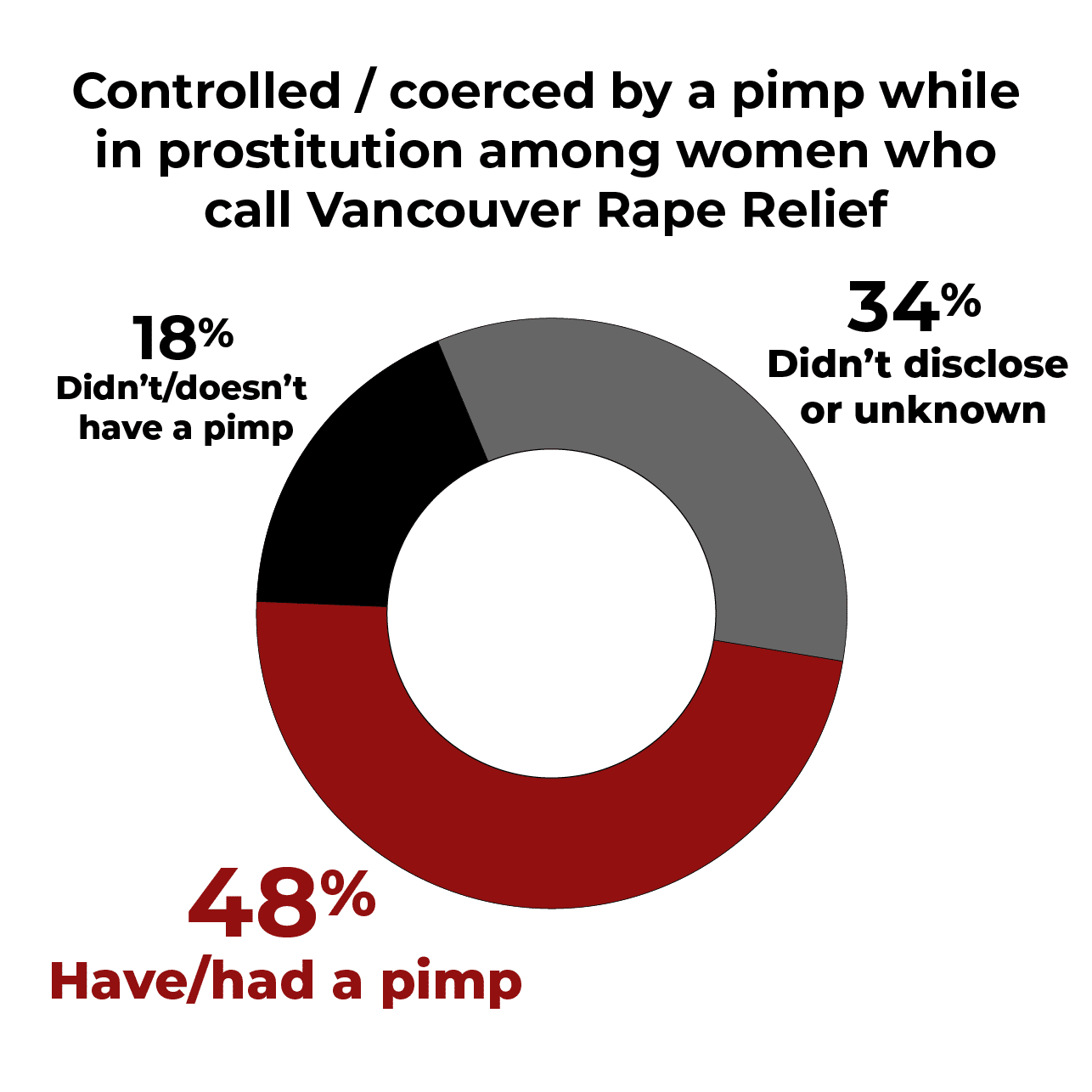 A full 48% of women in prostitution who called Vancouver Rape Relief disclosed being controlled/coerced by a pimp. Often the pimp was their male partner and sometimes, the father of their children. Weโve observed that pimps often sustain their power over women with physical violence and/or by facilitating and maintaining womenโs addiction.