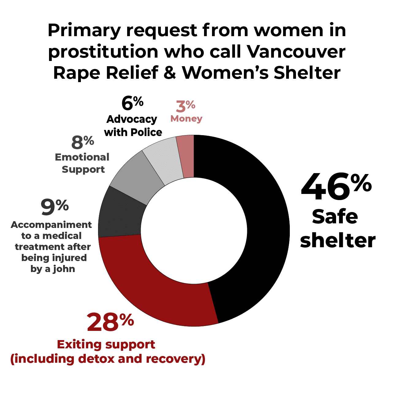 The primary request of 45% of the women in prostitution who called VRR was a safe shelter. This reflects the need for safety from a pimp or a john, lack of means to rent a place and the need for support from other women. Support in exiting prostitution is a common primary request as well (27% of calls). Emotional support and money are often secondary requests of women in prostitution.