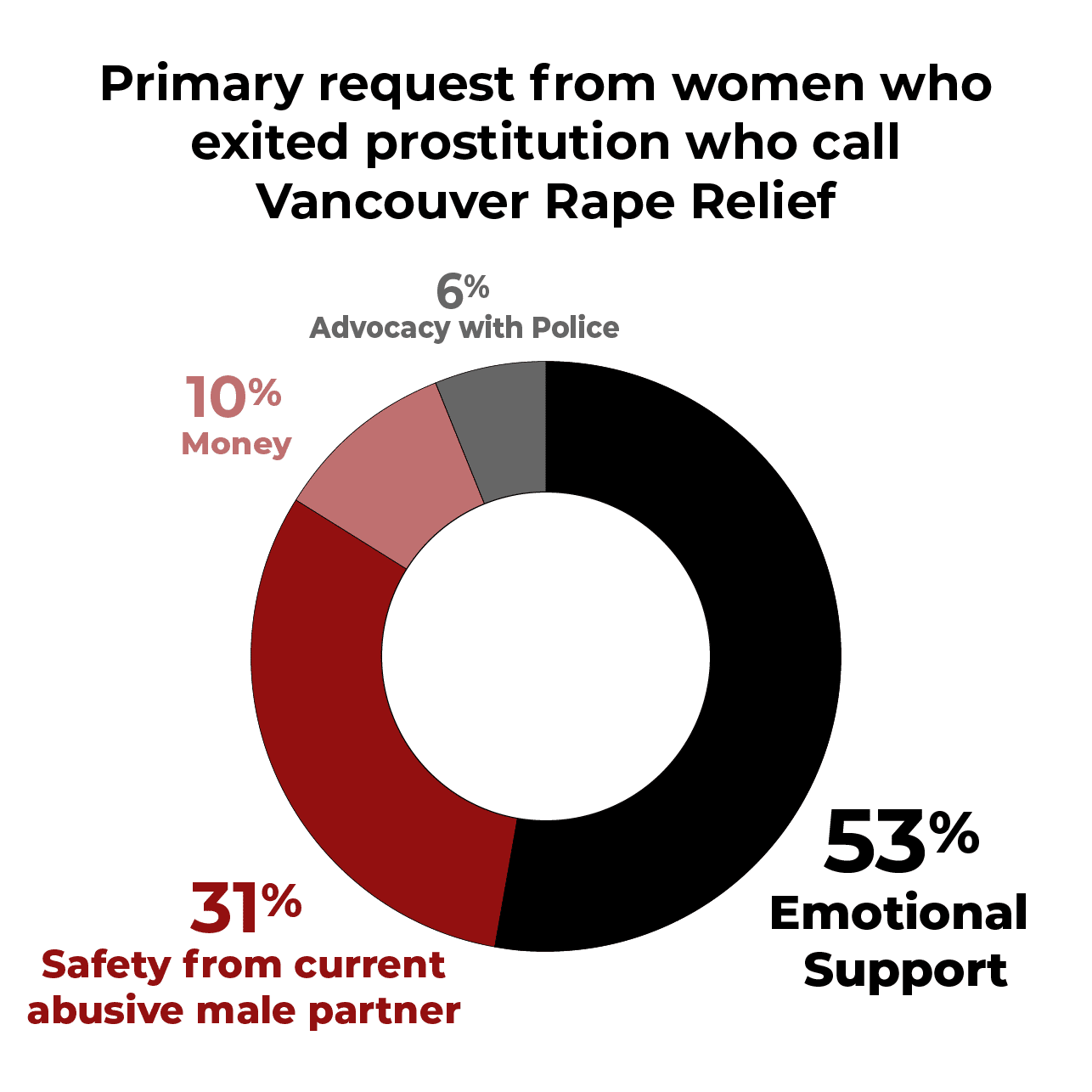 Women who are no longer in prostitution often suffer from post-traumatic symptoms, regardless of how long it has been since they exited. They call Vancouver Rape Relief for peer counselling and support groups.